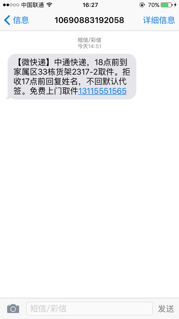 手机短信收到快递信息【快递通知】尊敬的客户,您的包裹已到达本地快递中心,等待配送。运单号为XXXXXXX,请携带身份证明及时领取。如有疑问,请联系客服热线XXX-XXXX-XXXX。... 2025-10-17 - [阅读全文]